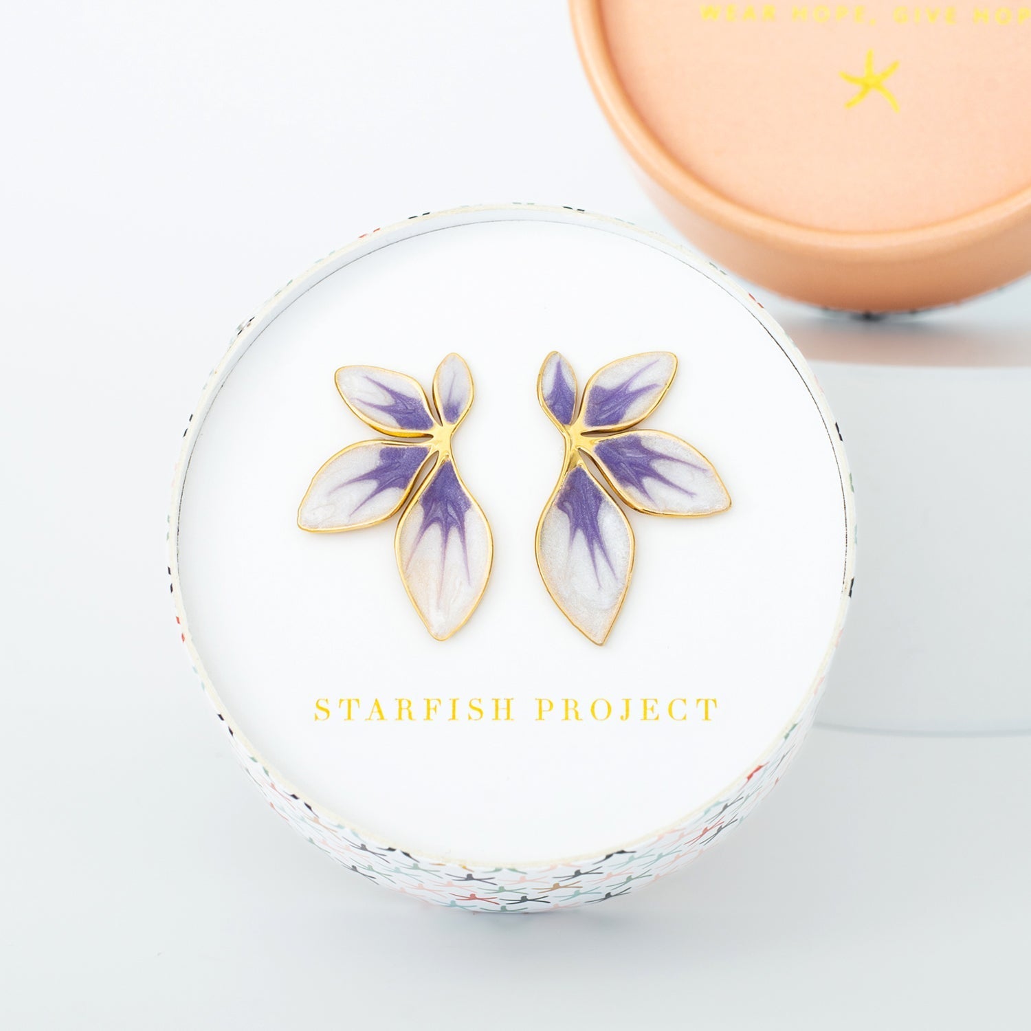 The Flourish Earrings feature modern, geometric petals painted in glittering lavender enamel, framed in radiant 14K gold plating. Artful and feminine, they bring a fresh pop of color that feels just as right with a flowing dress as it does with your everyday go-to outfit.
